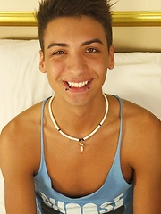 Smooth twink Roman Daniels busts a nut onto his stomach.