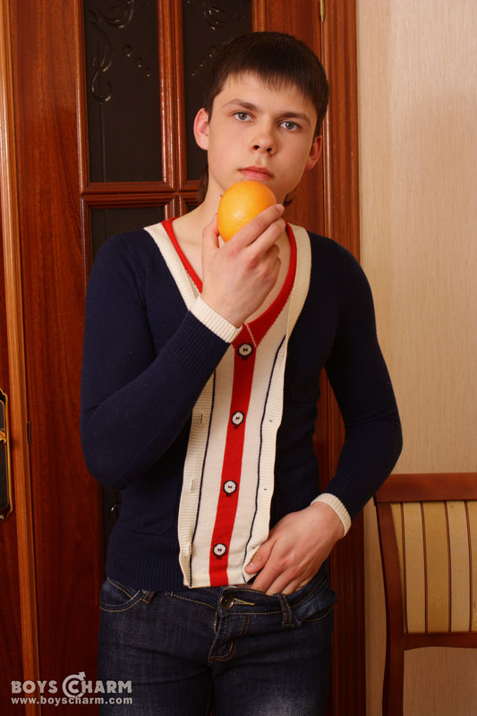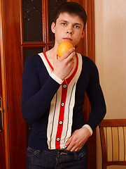 Sexy boy plays with an orange while stripping off