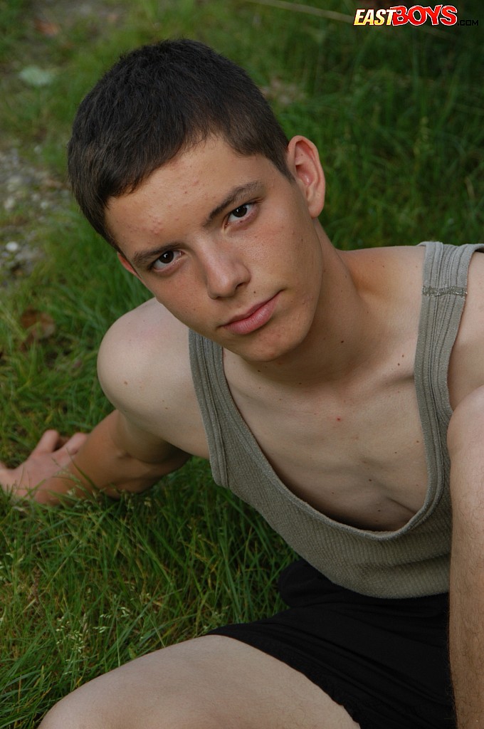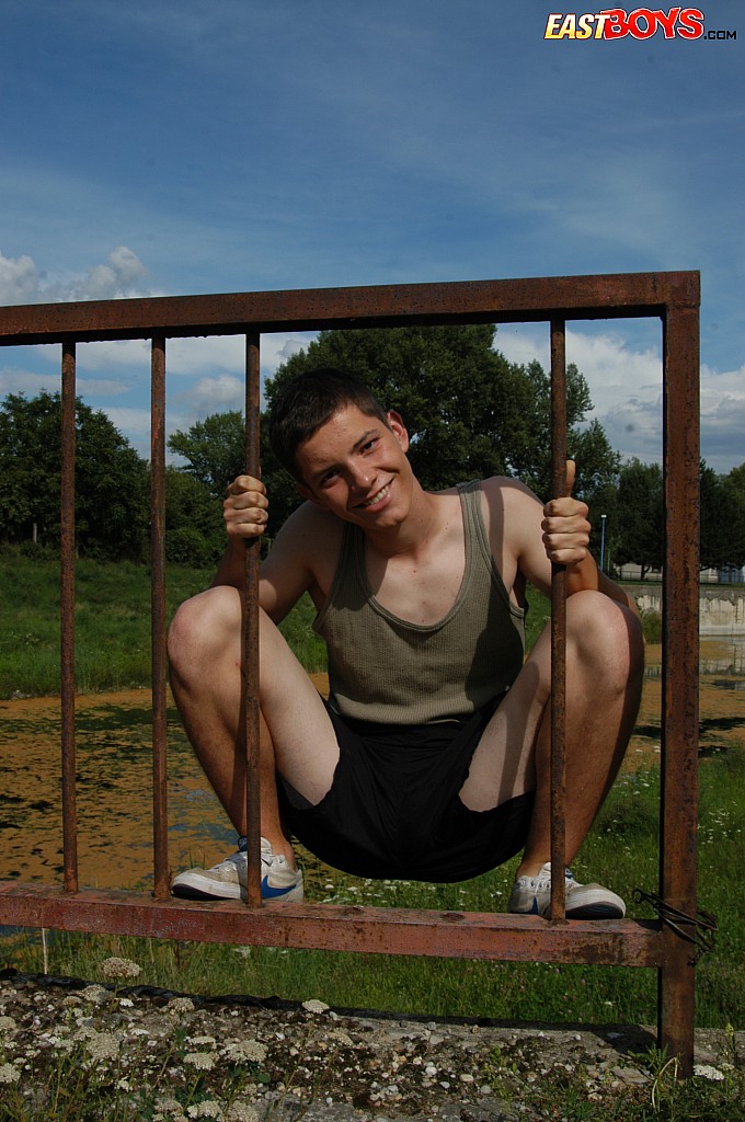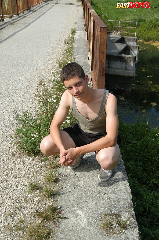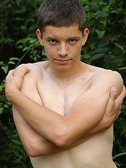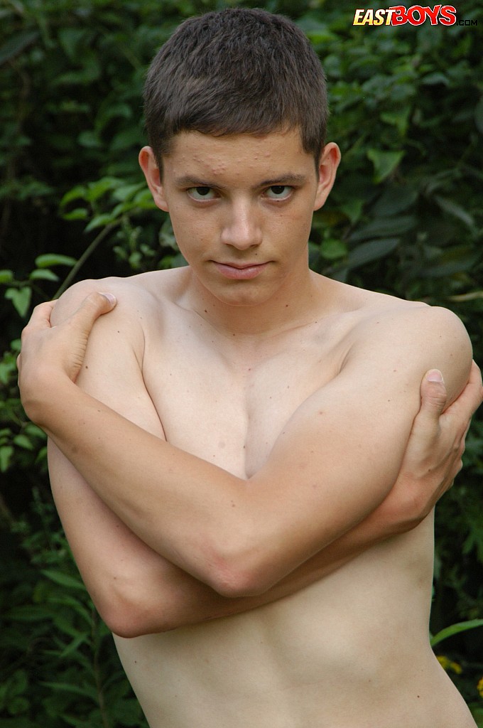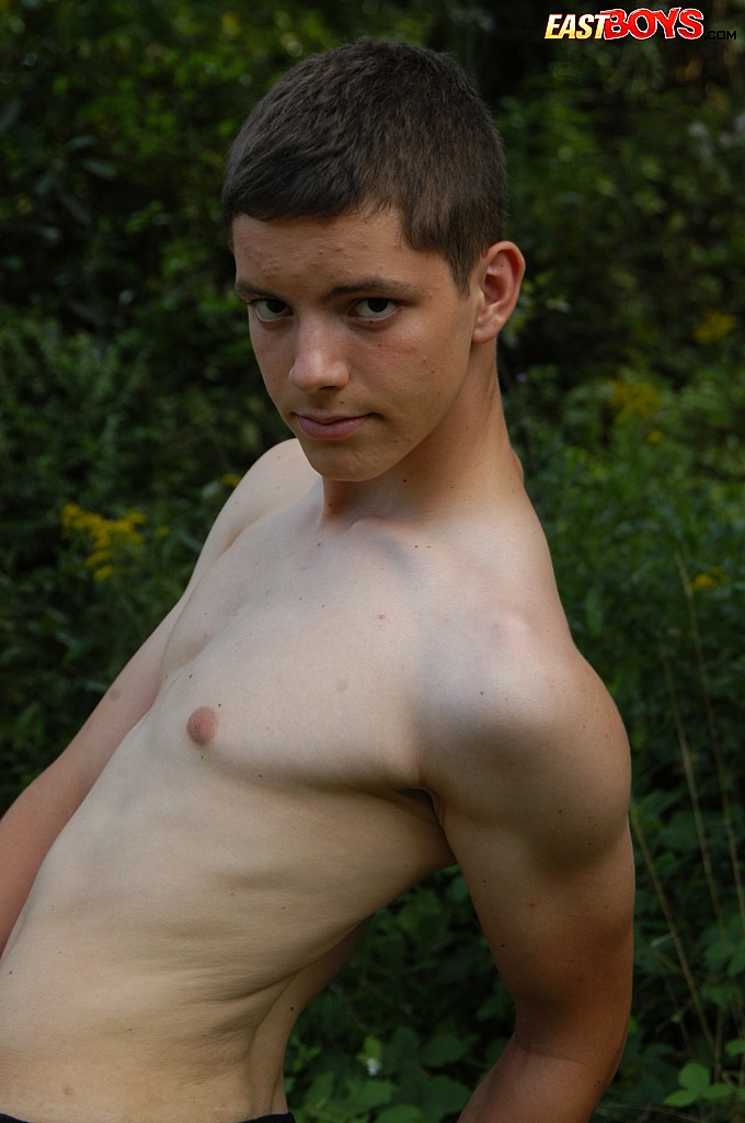Small twink guy posing naked outdoors