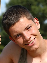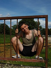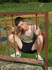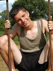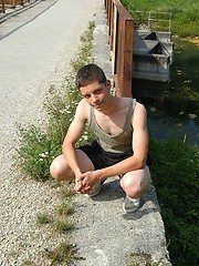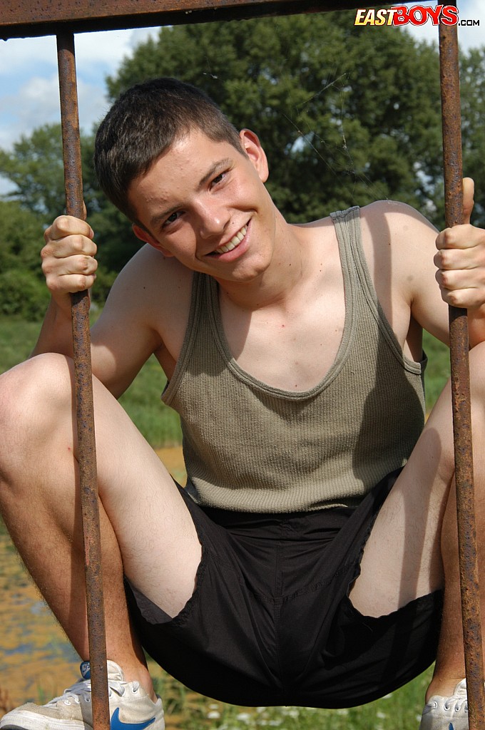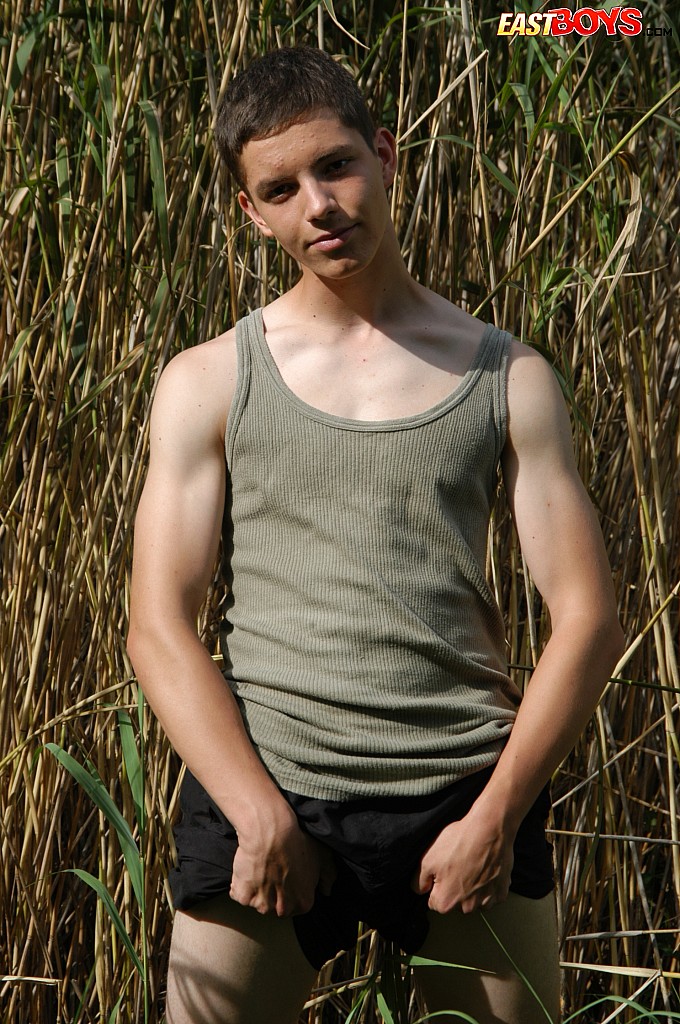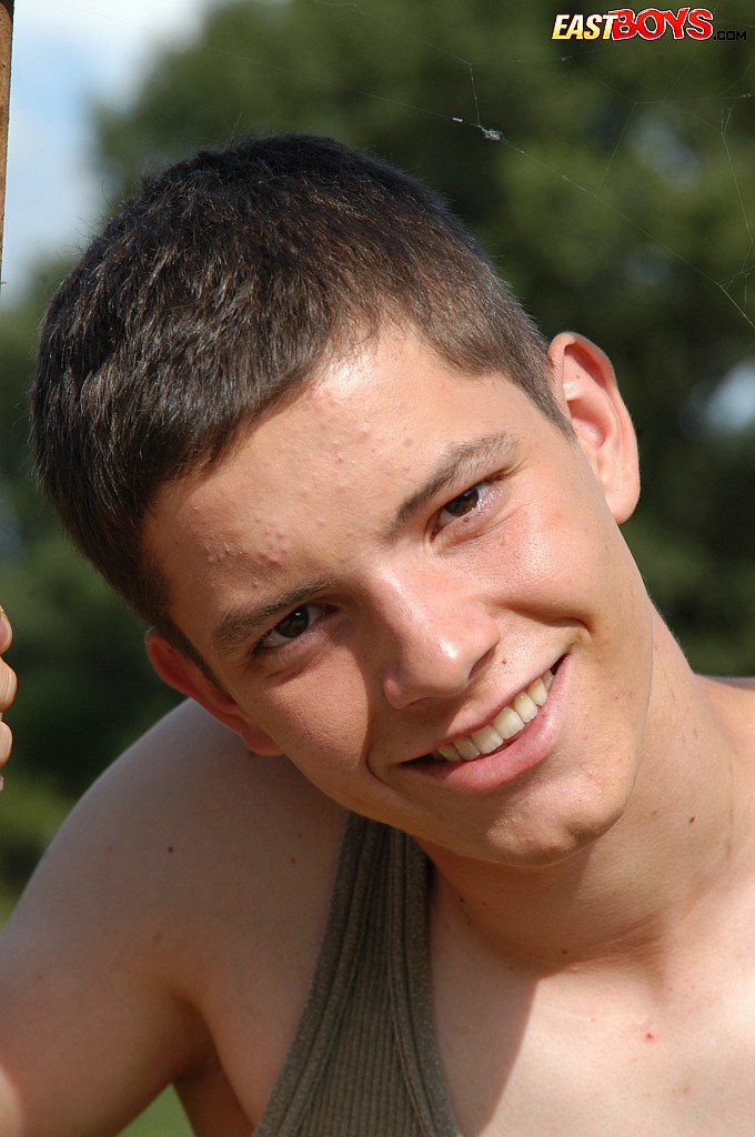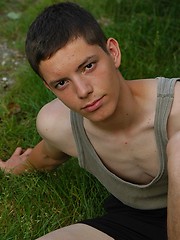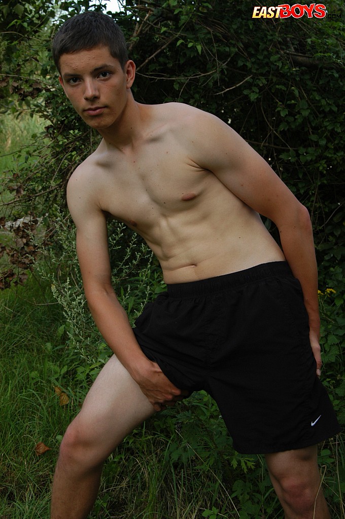Small twink guy posing naked outdoors