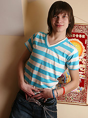 Cute long-haired twink boy jerking uncut dick