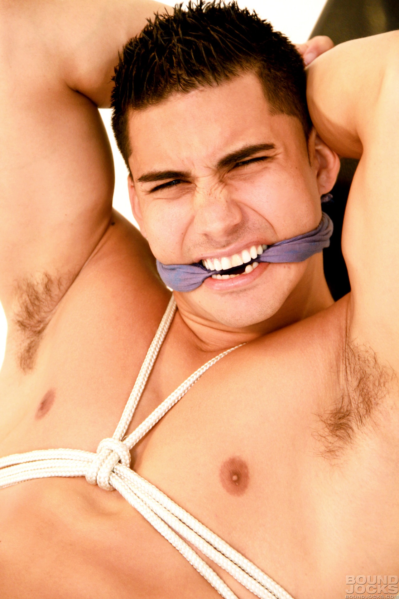 Hot brunette jock Topher DiMaggio bound posing in the gym