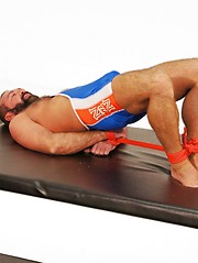 Athletic hunky bear playing with bounded daddy