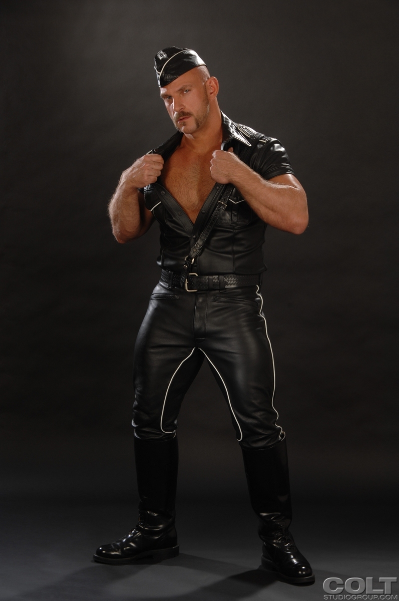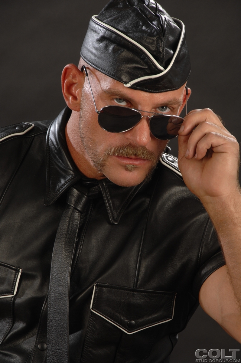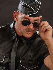 Hunky dad posing in solder and leather uniform