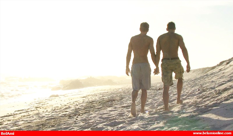 Jocks enmeshed in passionate kissing all alone on a secluded beach