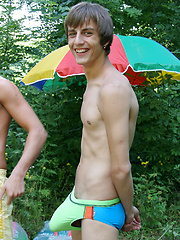 These four tanned twinks have found a quiet corner in the bushes and are busy sucking cock